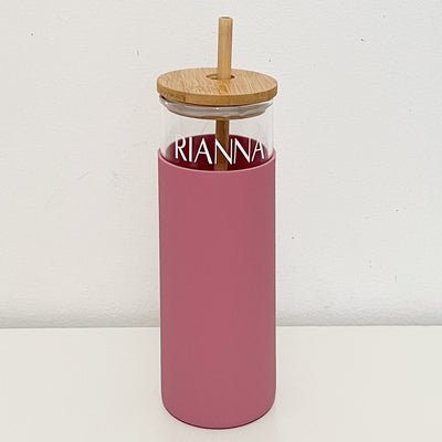 These classic glass 500ml cups, come with a removable Pink sleeve, and a bamboo lid & straw.