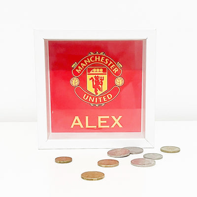 This white wood shadow box has a coin slot on top and window front to watch all your savings grow.